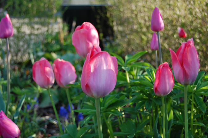 På en dag der er grå og trist er der stadig masser af farver i haven. Der er ikke blevet arbejdet ret meget i haven i dag, så der er blevet tid til en rundtur med kameraet, som fandt frem til tulipaner, asparges, stedmoder, perlehyacinter, pæreblomster og kirsebærblomster.